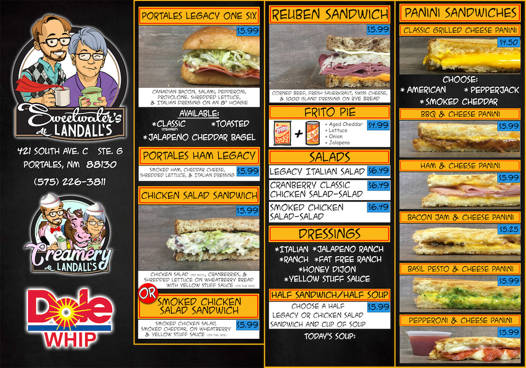 Welcome to Sweetwaters at Landalls, a delightful culinary gem located at 421 S Avenue C Ste G, Portales, NM. This cozy establishment is renowned for its unique blend of home-cooked meals and artisanal ice creams, both crafted to perfection. The menu highlights include the indulgent Garlic Bread Bowl and the flavorful Legacy Sandwich, which has earned rave reviews for its soft bread and savory fillings. You can also enjoy refreshing Italian Sodas made with Sprite Zero. Visitors rave about the cozy ambiance enriched by local decor and the attentive service from the friendly staff.
